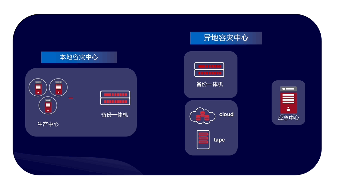 DBackup 無需掛盤的文件合成功能,深受市場青睞。新版 DBackup 進一步推出文件合成的遠程復制功能,采用“初次全復制,后續增量復制”的形式,助力用戶實現兩地三中心的數據保護方案。當本地數據中心出現故障時可通過異地容災中心進行數據的快速恢復。