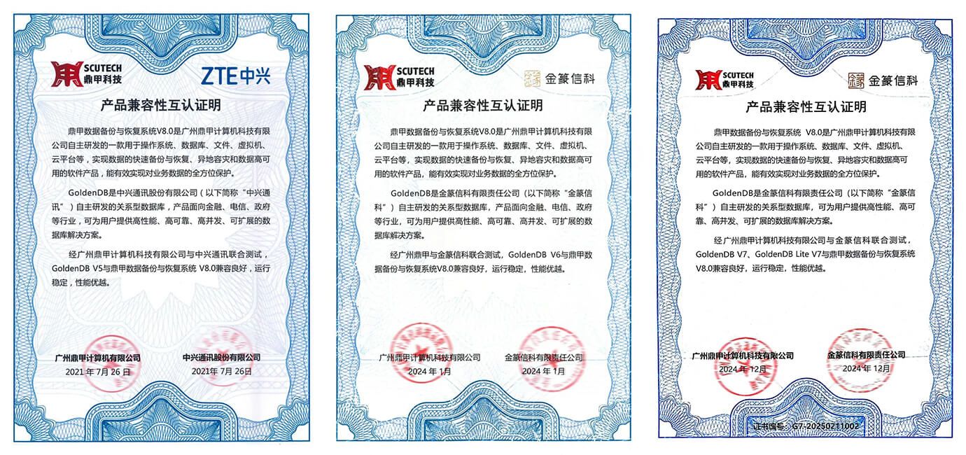 值得一提的是,鼎甲與 GoldenDB 的兼容認證并非首次。在 GoldenDB 的歷史版本(包括V5、V6)中,鼎甲數據備份與恢復系統已多次完成兼容性測試,并保持長期穩定的技術適配,這體現了鼎甲在信創數據庫生態建設中的持續投入。